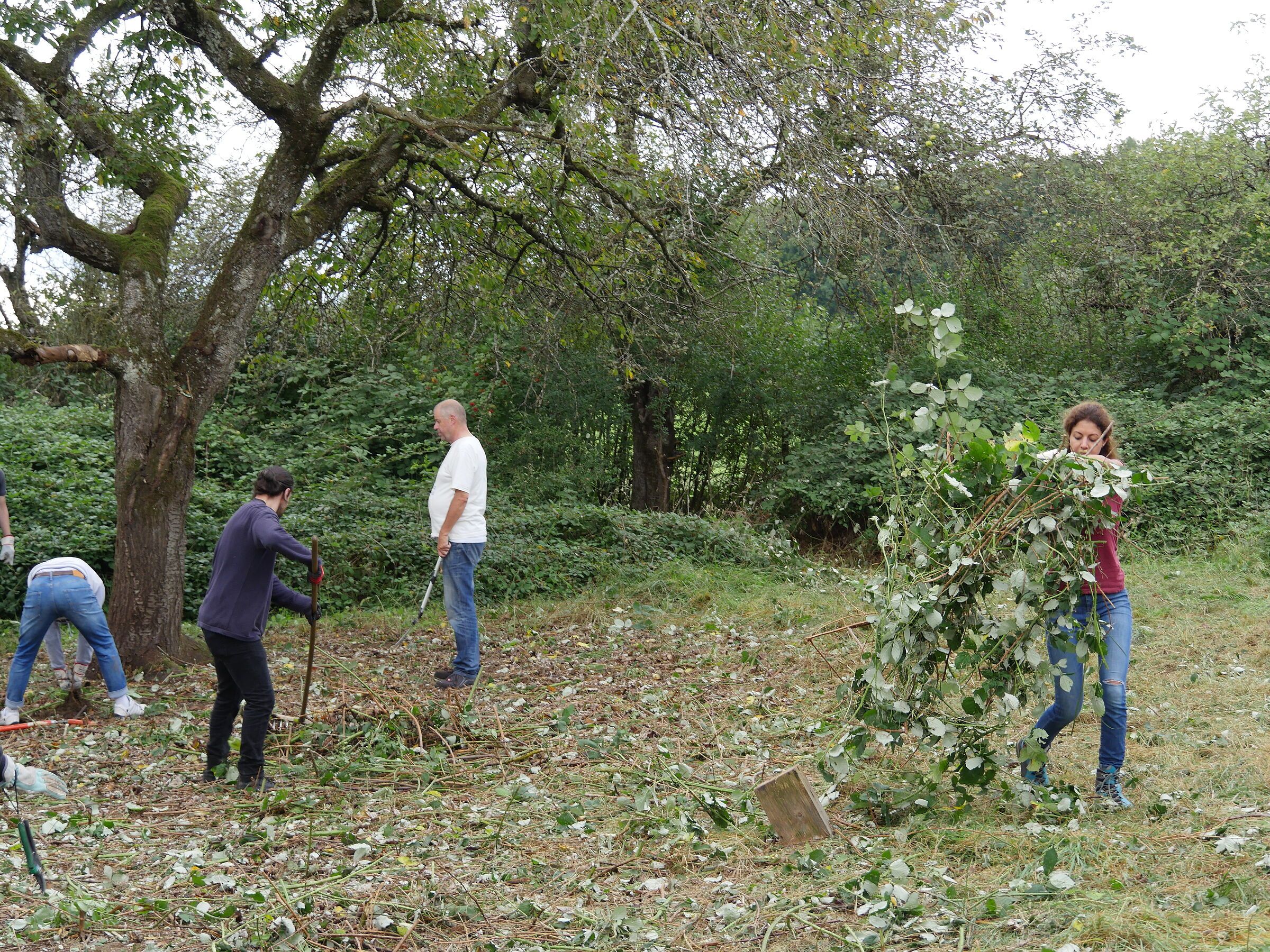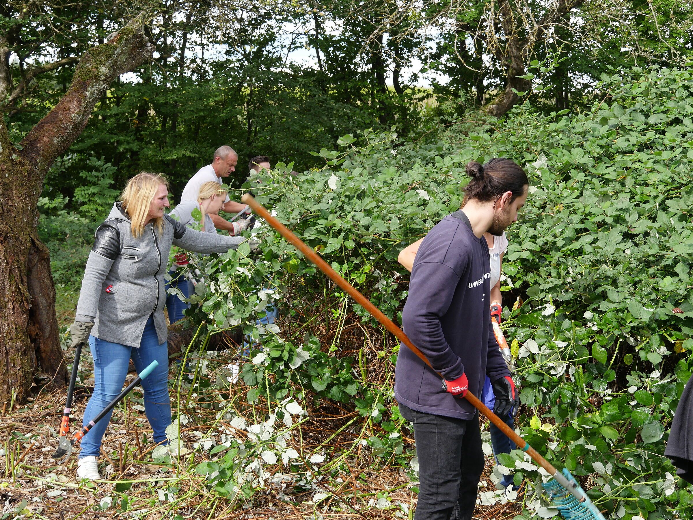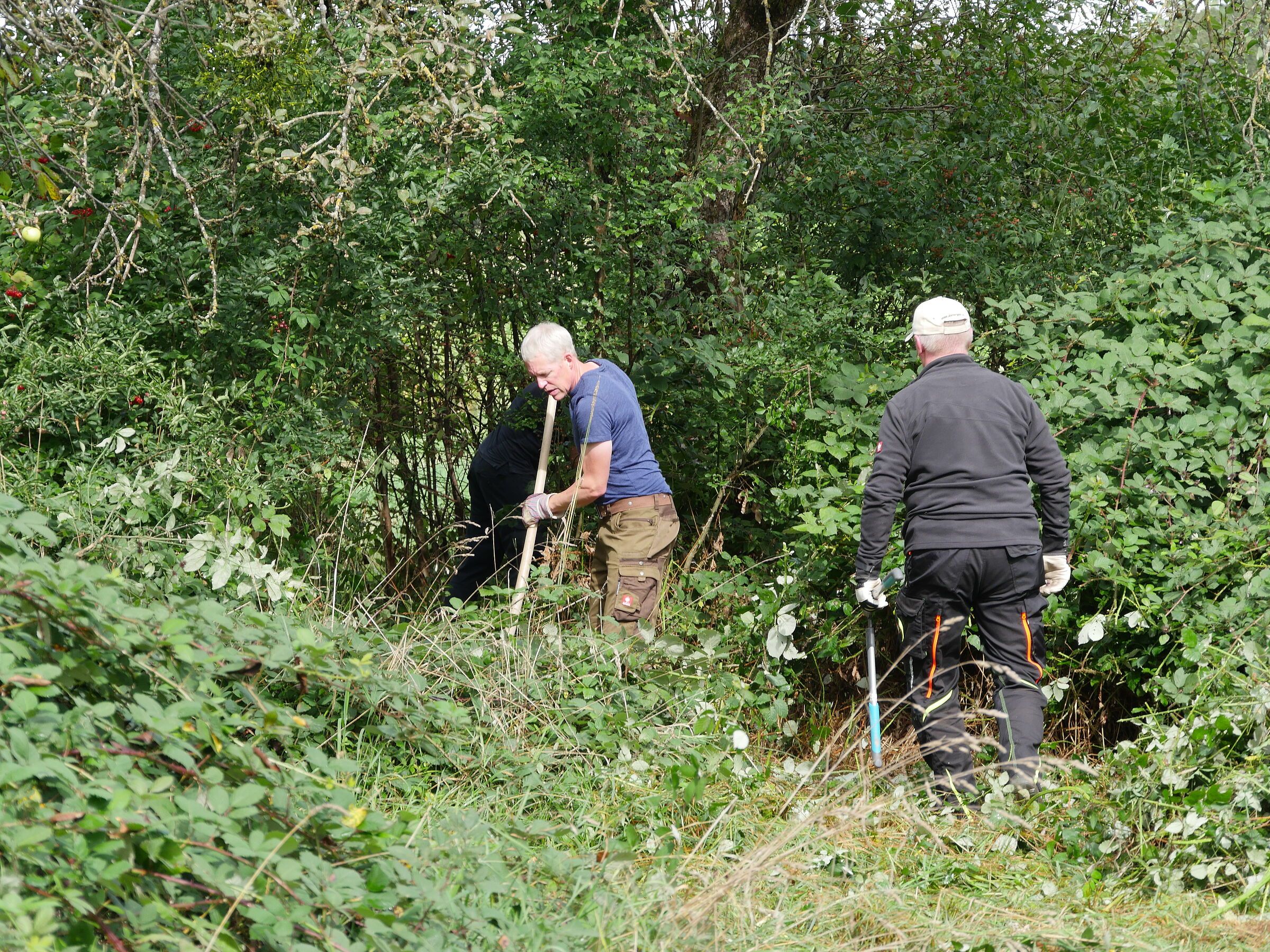 Nach einer kurzen Begrüßung wurde das Werkzeug verteilt und wir schritten zur Tat. Auch seitens des BUND Naturschutz hatten sich willige Helfer eingefunden. Uli Schweizer, Claudia Shepherd, Regina Wegemann, Klaus Grünebach und Sepp Biesenberger waren mit von der Partie. Bei großartiger Stimmung - die Bilder sprechen für sich - rückten wir den Brombeeren zu Leibe. Es war beeindruckend, was an diesem Tag an Brombeeren beseitigt werden konnte. Hell und licht wirkte das Grundscstück nach unserer Aktion.